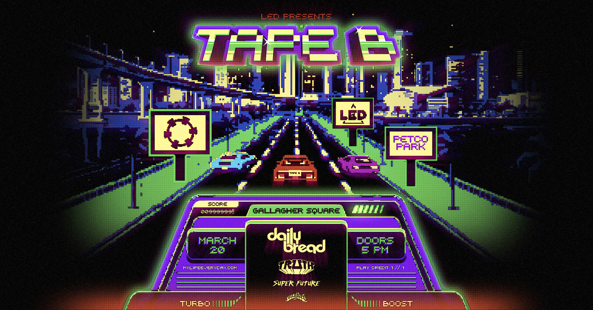 Fri, March 20 | 5:00 pm - 11:00 pm Tape B Gallagher Square 899 J St, San Diego, CA, United States LED Presents Tape B at Gallagher Square on Friday, March 20, 2026. With support from daily bread, Truth, Super Future, & Cozykev.